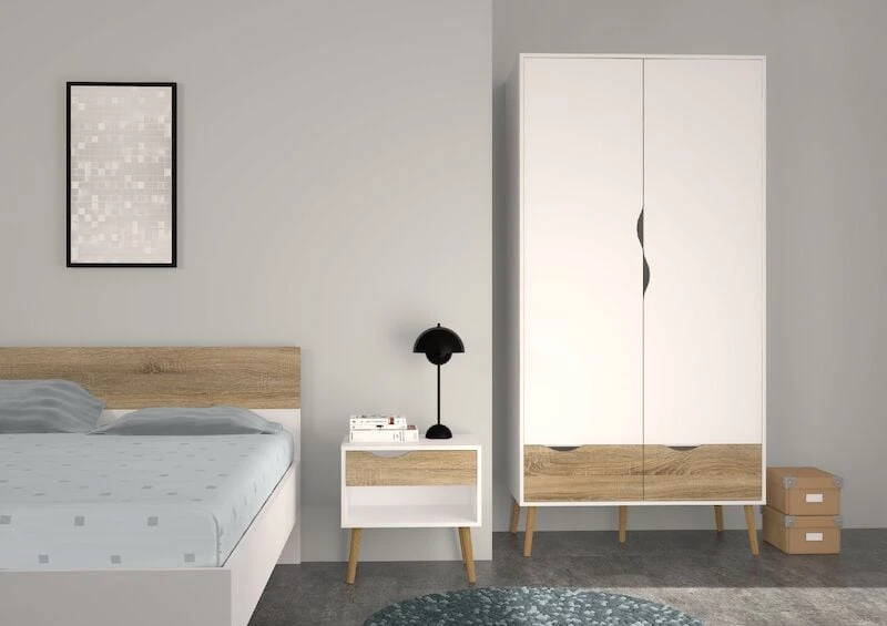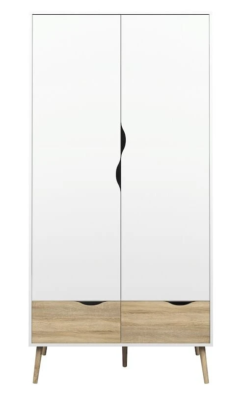 Kaunis ja käytännöllinen Delta vaatekaappi runsaalla säilytystilalla. Materiaalina valkoinen kalustelevy. Korkeat tammijalat, värinä musta tai tammi. Vaatekaapissa on tankotilaa henkarivaatteille, yksi avohylly sekä alhaalla kaksi laatikkoa. Laatikko on valittavissa joko mustan tai tammen värisellä etuosalla. Tuote toimitetaan osina paketissa, kahdessa paketissa.
