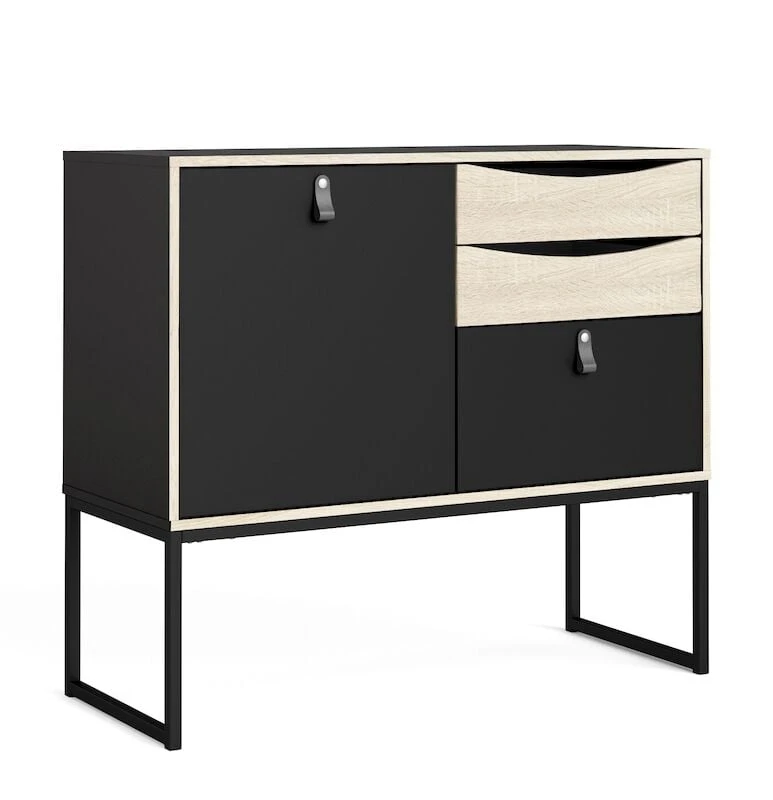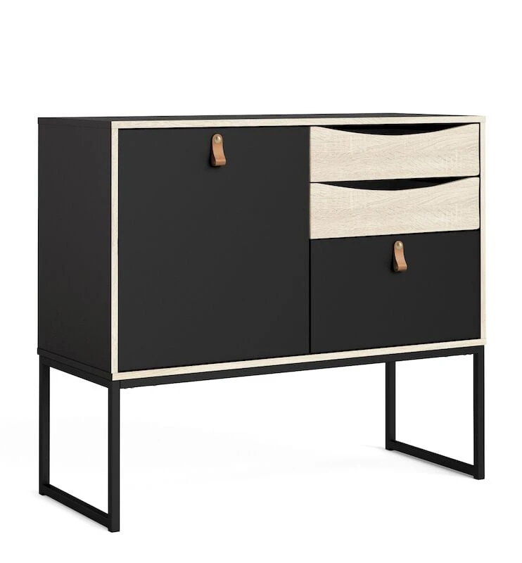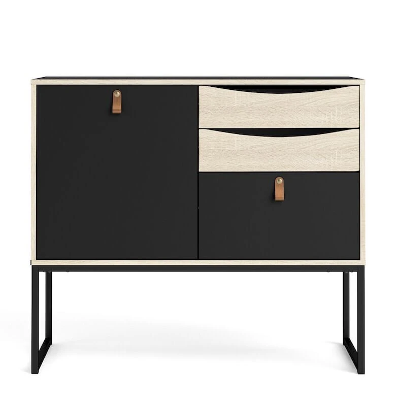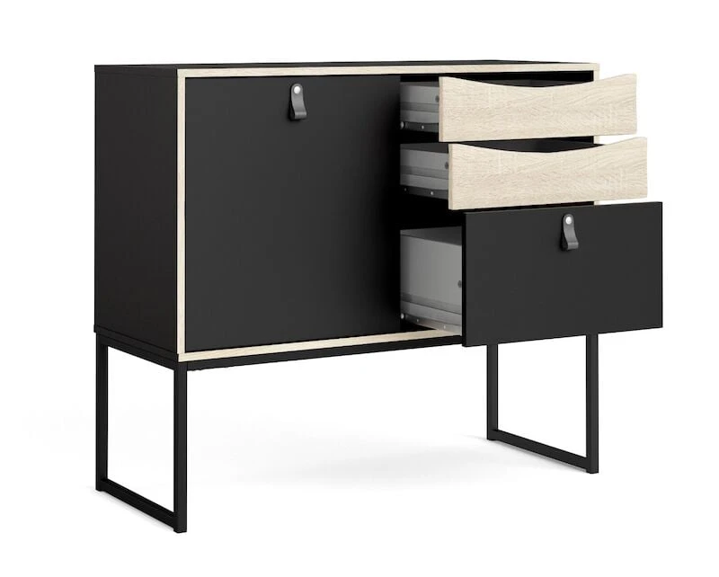 Kaunis ja moderni Stubbe senkki korkeilla metallijaloilla. Senkki on näppärän kokoinen ja se on helposti sijoiteltavissa kodin eri tiloihin. Senkissä on kaunis yhdistelmä vaaleaa puuta ja mustaa, nahkaiset vetimet viimeistelevät kokonaisuuden. Senkin mukana tulee nahkaiset vetimet mustana ja ruskeana, joten voit itse päättää kumman väriset haluat asentaa senkkiin. Senkissä on yksi ovellinen kaappi, jonka takana on kaksi hyllyä (yksi hyllylevy) sekä kolme vetolaatikkoa, joten se kätkee sisäänsä hyvin säilytystilaa. Yhdistä saman sarjan vitriiniin ja tv-tasoon.