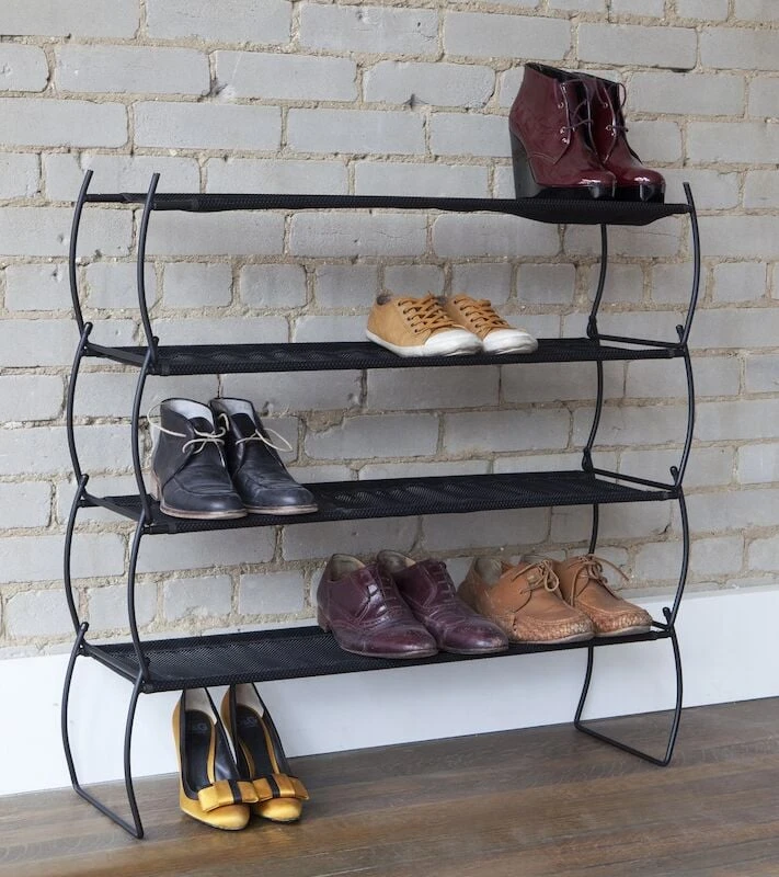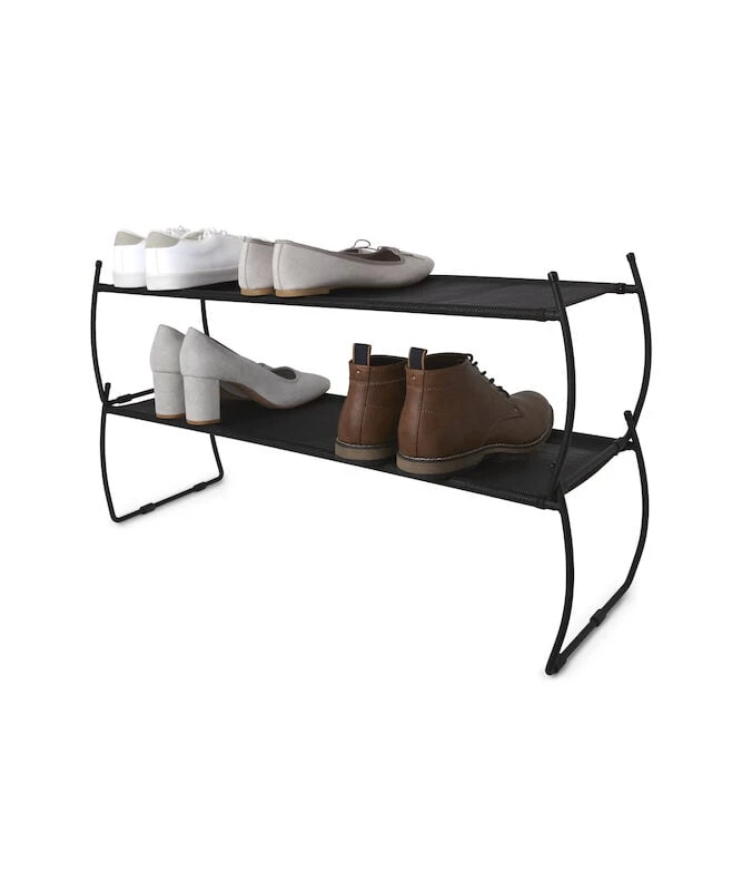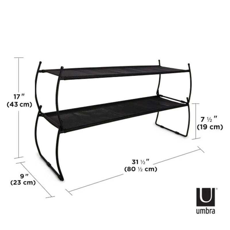 Umbra Imelda kenkähylly koostuu kahdesta erillisestä hyllystä, joita voi käyttää joko erillään tai yhdessä. Valmistettu metallikehyksistä, joissa on hengittävä vinyyliverkko. Telineeseen mahtuu jopa 10 kenkäparia. Hyllyn jaloissa olevat kumitulpat pitävät tuotteen hyvin paikallaan.
