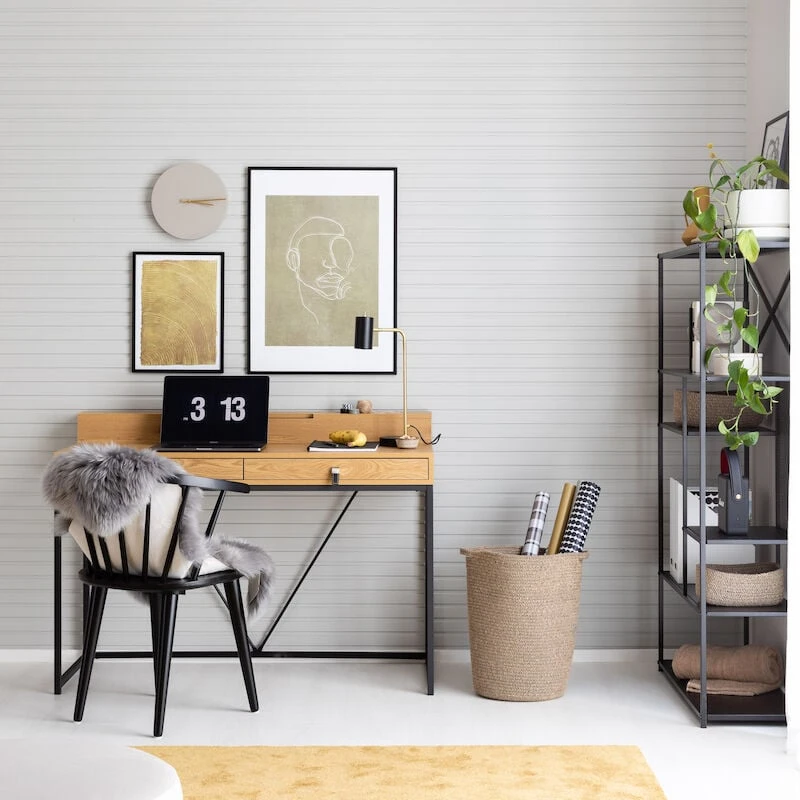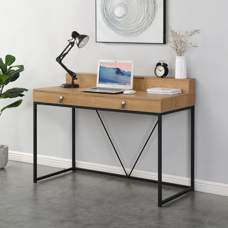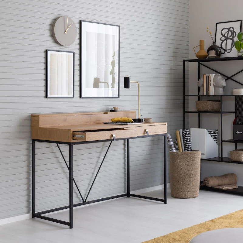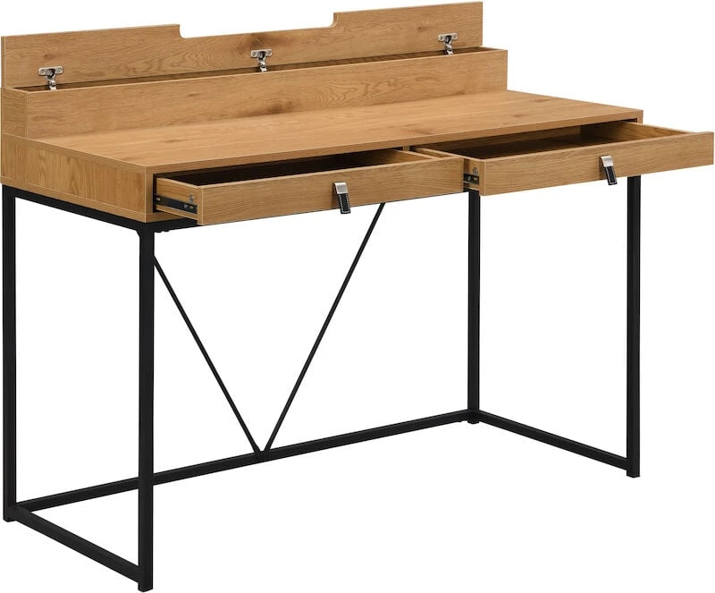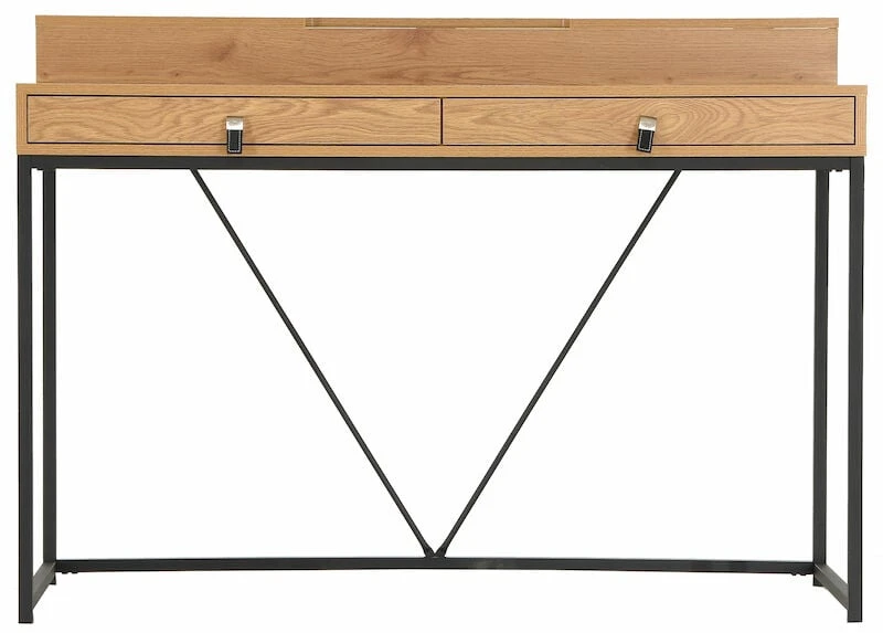 Tämän pöydän avulla teet työnteosta ja opiskelusta houkuttelevaa. Todella kauniissa ja tyylikkäässä Aarni työpöydässä on mustaksi maalatut metallijalat ja ykityiskohtana metallikehys pöydän takaosassa. Tammenvärinen kansiosa kruunaa kokonaisuuden. Pöydässä on paljon säilytystilaa: kaksi vetolaatikkoa edessä sekä pöydän päällä oleva säilytyslokero. Kansi MDF:ää ja paperiviilua. Laatikoissa on kuulalaakerikiskot sekä metalli-/nahkavetimet. Säilytyslaatikon kannessa on aukipitotoiminto sekä hidastettu lasku.