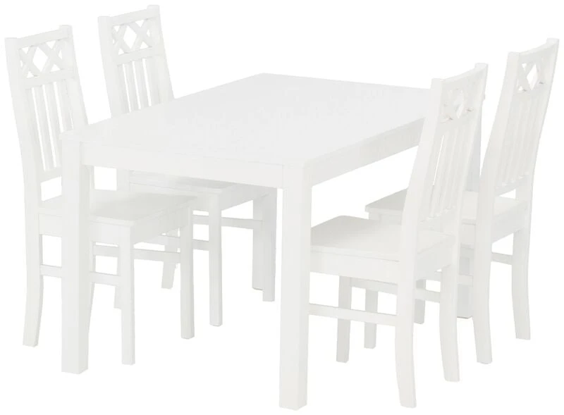 Tukeva koivusta valmistettu 4-hengen Aino ruokailuryhmä. Pöydän koko 80×130 cm johon mahtuu hyvin 4 tuolia. Valmistettu tukevasta koivusta, poikkeuksena kokonaan valkoisen tuotteen kansi joka tehty mdf-levystä. Pintakäsitelty petsilakalla tai valkoisella maalilla.