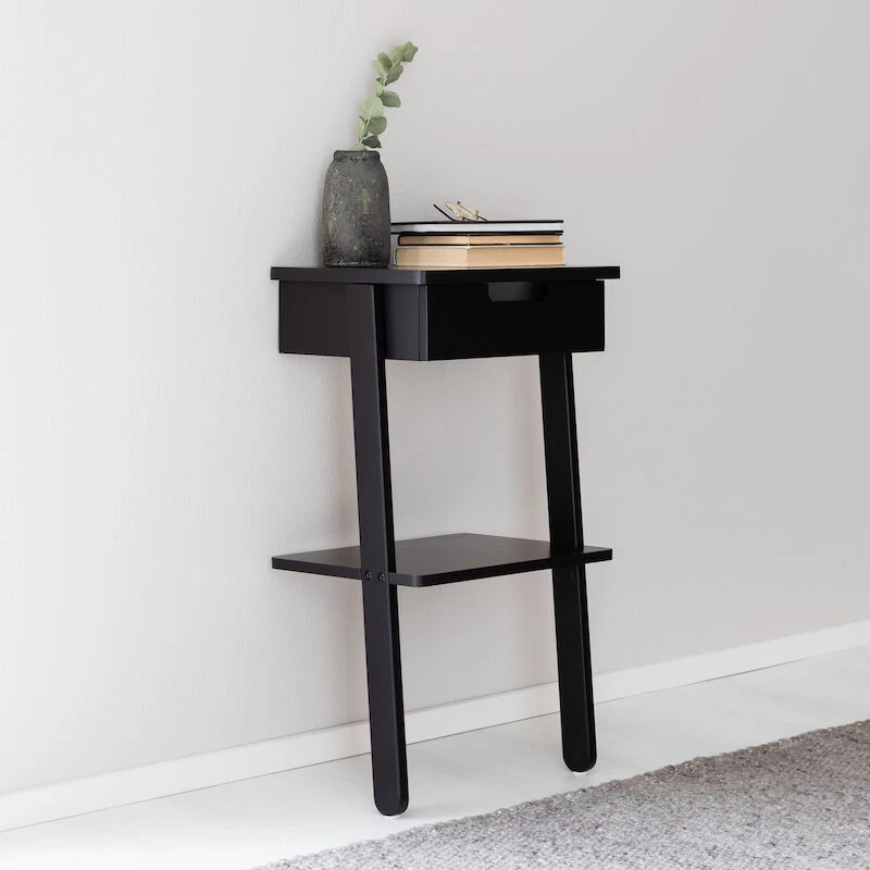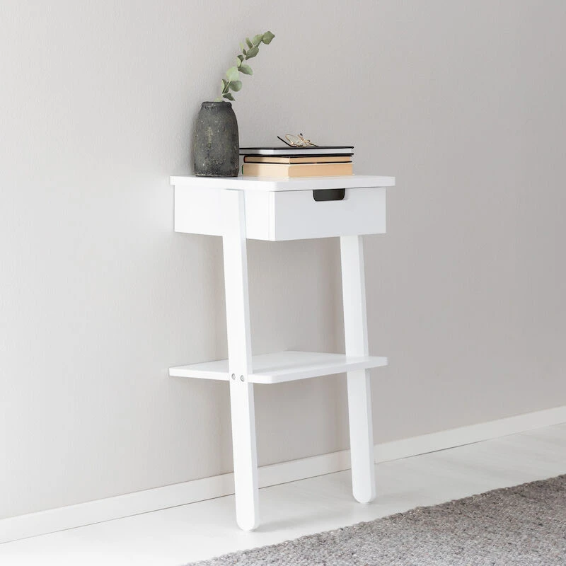 Moderni ja sirokokoinen Arki yöpöytä sopii yöpöydäksi tai vaikka eteiseen pieneksi sivupöydäksi. Pöydässä on hyllytaso ja vetolaatikko pienemmille tavaroille. Pöytä kiinnitetään seinään mukana tulevilla ruuveilla. Materiaalina maalattu MDF. Koko pöydän kantavuus max.15 kg, vetolaatikon kantavuus 3 kg.