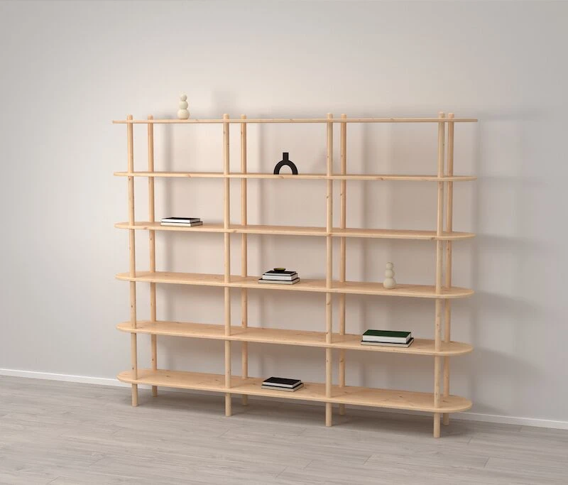 Hyllyt ovat pyöristetyt, mikä tuo pehmeyttä ja harmoniaa sisustukseen. Modulaarinen järjestelmä mahdollistaa erilaisten kokonaisuuksien kokoamisen esimerkiksi kirjoille, koriste-esineille tai säilytyslaatikoille. Hyllykkö on helppo ja nopea kasata, erillisiä työkaluja ei tarvita.