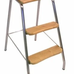Metallinen porrasjakkara 63 cm, runko kromattua huonekaluputkea ja askelmat joko lakattua koivua tai pähkinän väriin petsattua koivua. Tukeva perusmallinen porrasjakkara on joka kodin porrasjakkara. Tämä jakkara on pinottavissa päällekkäin ja VTT:n hyväksymä malli. Mikä parasta: kotimainen laatutuote!