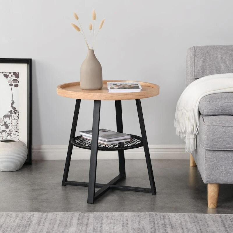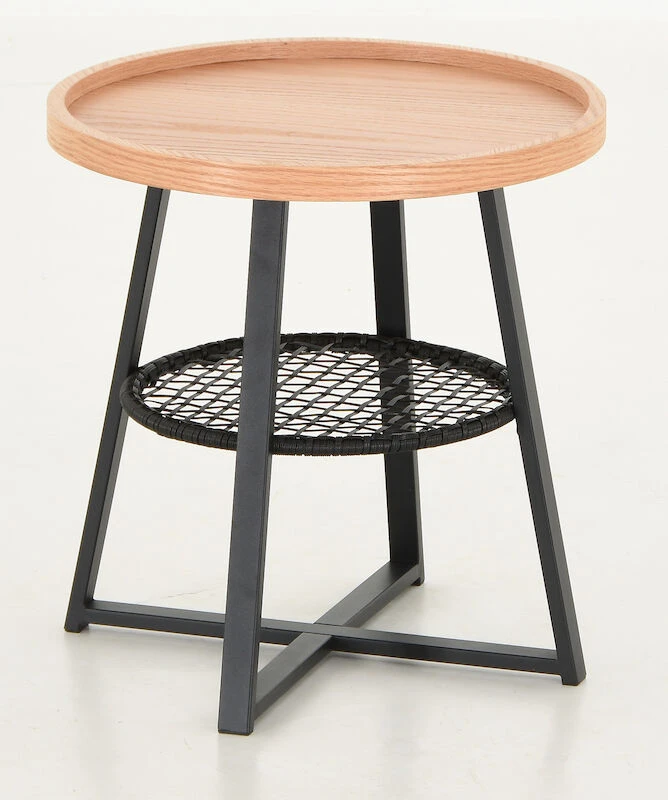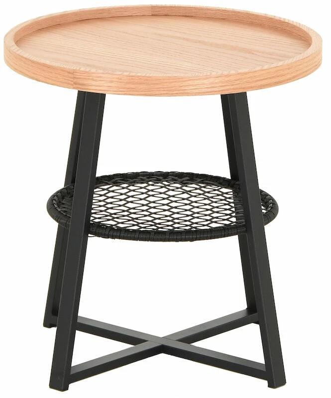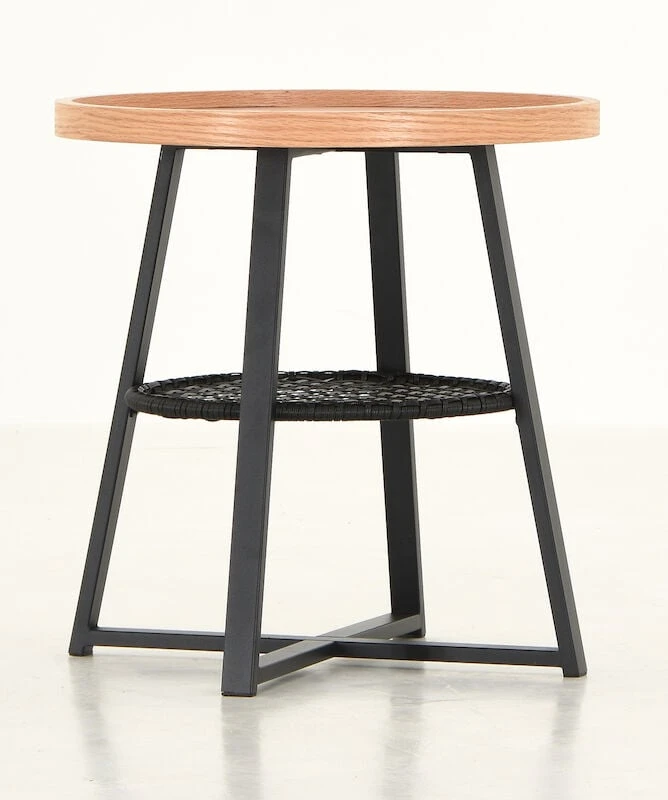 Pyöreä Hilla sivupöytä sopii täydentämään kodin oleskelutilojen sisustusta. Pöydän muotoilu sekä eri materiaalien yhdistelmä tuo pöytään persoonallisuutta ja näyttävyyttä. Alataso sopii erinoimaisesti lehtien tai kirjojen säilytykseen jättäen tasolle riittävästi laskutilaa. Sivupöydän runko on mustaksi maalattua metallia, alatason punos muovista rottinkia. Alatason halkaisija on 37cm. Kansi on mdf-levyä, jossa puuviilu, väri tammi.