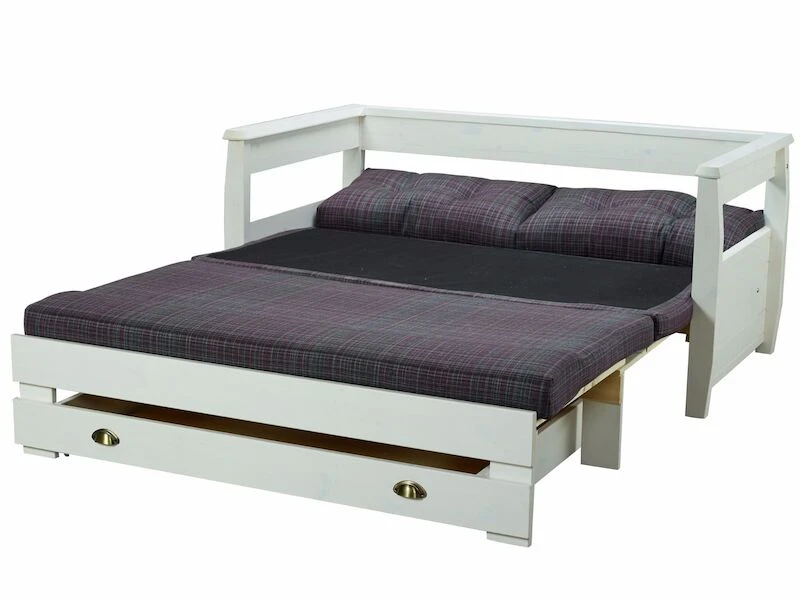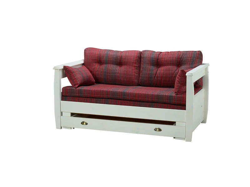 Kuultomaalattu Janne 2-istuttava laveripaketti, josta saa helposti levitettyä tilavan, tilapäisen vuoteen. Patjakoko on 75 x 140 cm ja levitettynä 140 x 190 cm. Mukaan kuuluvat kuvan vuodevaatelaatikko ja patjasarja valitulla värillä sekä kaksi koristetyynyä. Vuodevaatelaatikossa tilaa vuodevaatteille, laatikossa sälepohja. Laveri ja vuodevaatelaatikko valmistettu männystä. Patjasarjan pehmusteena vaahtomuovi ja vanu.