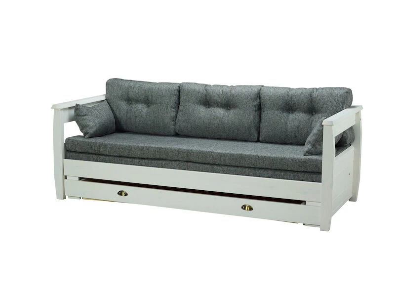 Janne 3-istuttava laveripaketti on kuultomaalattu, perinteinen ja levitettävä laveri. Laveriin saa helposti levitettyä tilavan, tilapäisen vuoteen. Patjakoko 75 x 190 cm ja levitettynä 140 x 190 cm. Valitse sopiva patjasarja ja tilaa perinteinen laveripaketti kotiin tai mökille. Mukaan kuuluvat kuvan laverisohva, vuodevaatelaatikko ja patjasarja sekä kaksi pientä koristetyynyä. Vuodevaatelaatikossa tilaa vuodevaatteille, laatikossa sälepohja. Laverisohva ja vuodevaatelaatikko valmistettu männystä. Patjasarjan pehmusteena vaahtomuovi ja vanu.