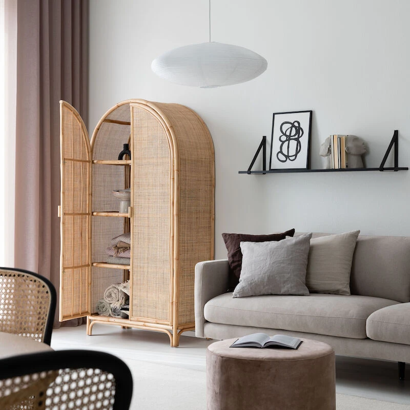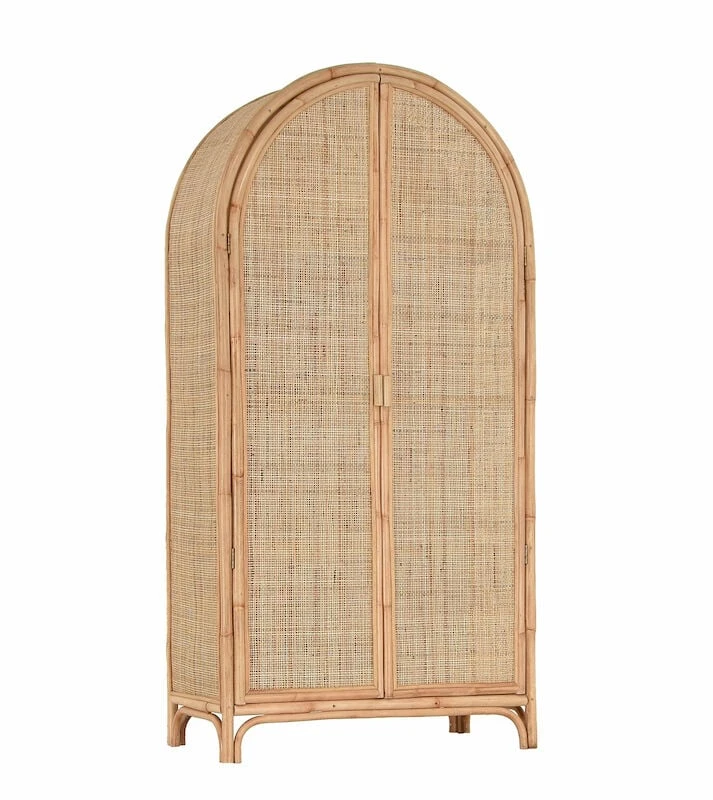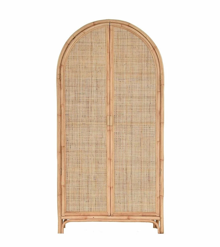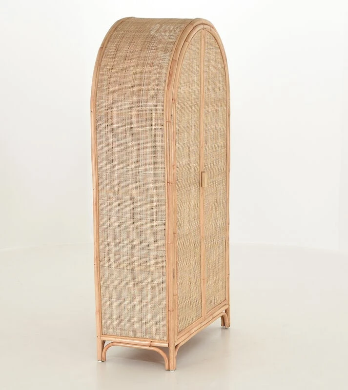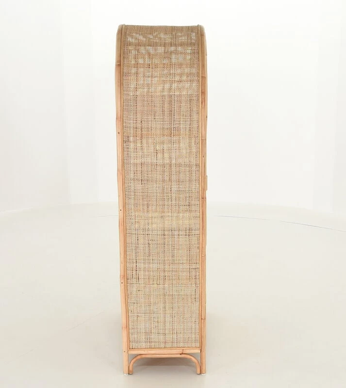 Juuri rottinkikaappi ihastuttaa yläosan kaarevalla muodollaan. Sen ovien taakse kätkeytyy paljon säilytystilaa kodin tavaroille. Upea ilmestys olohuoneeseen, makuuhuoneeseen tai vaikkapa mökille. Se tuo ihanaa kodikkuutta ja lämpöä sisustukseen sekä trendikästä kontrastia moderniin sisustustyyliin. Kaapin runko on puolikiillotettua rottinkia ja ovet sekä molemmat sivut rottinkipunosta. Kaapin sisällä on kolme kiinteää hyllyä.