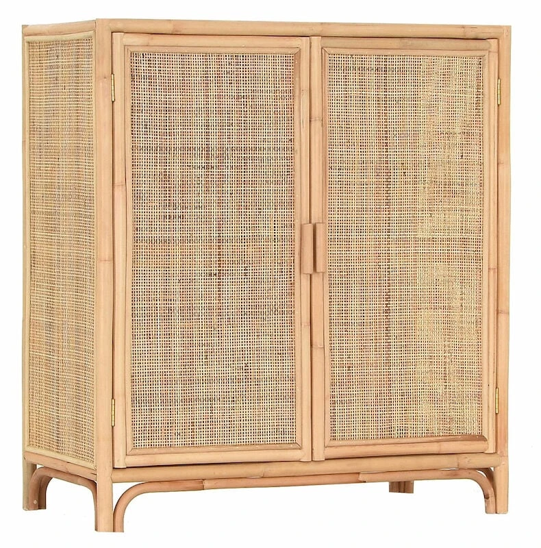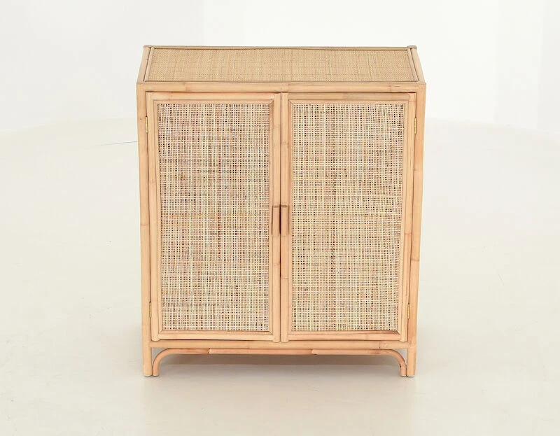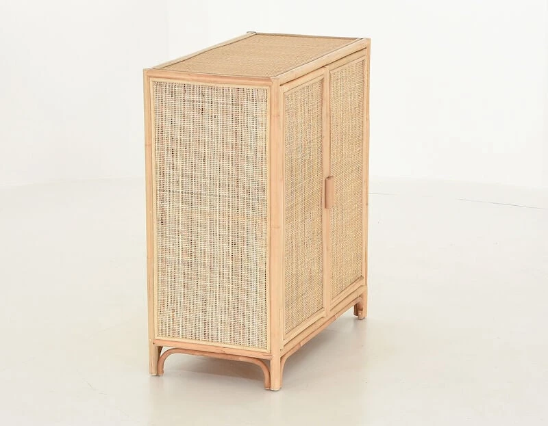 Kaunis, luonnonläheinen Juuri rottinkikaappi kahdella ovella. Kaapin runko on puolikiillotettua rottinkia ja ovet sekä molemmat sivut rottinkipunosta. Kaapin sisällä on yksi kiinteä hylly.