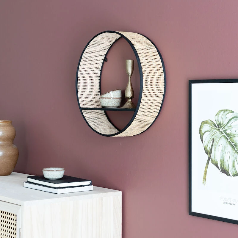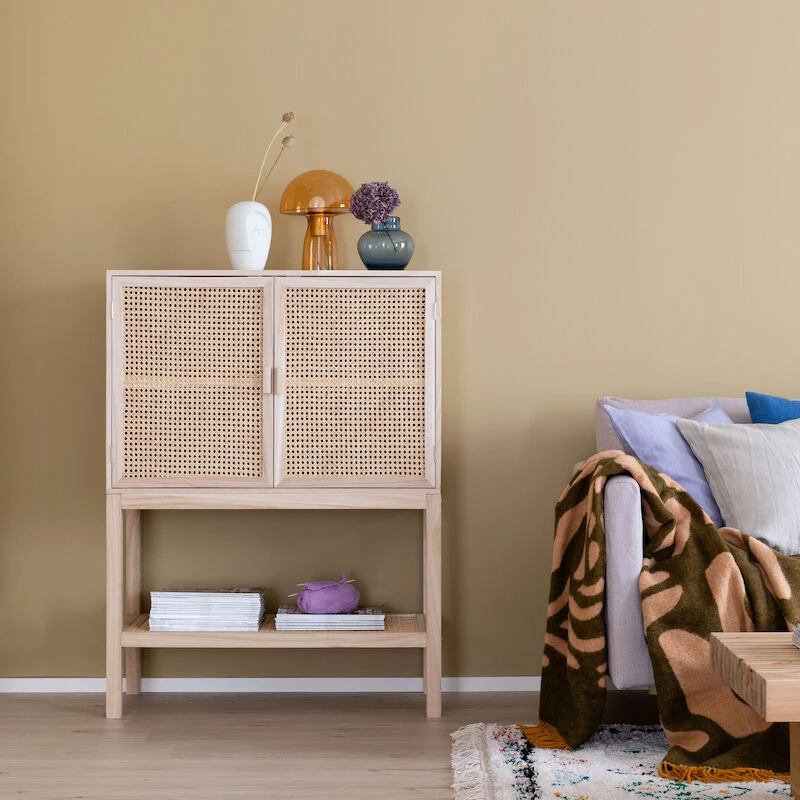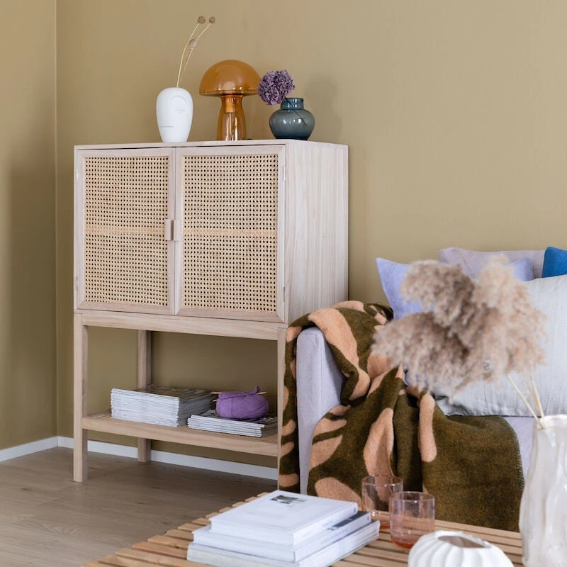 Kaapin runko ja ovien kehykset ovat hiottua, käsittelemätöntä keisaripuuta ja ovet rottinkipunosta. Kaapin yläosassa on neljä samankokoista hyllyä, joille saa näppärästi tavarat piiloon katseilta. Avoin alaosa keventää kaapin ilmettä. Kaappitilan korkeus on 60cm.