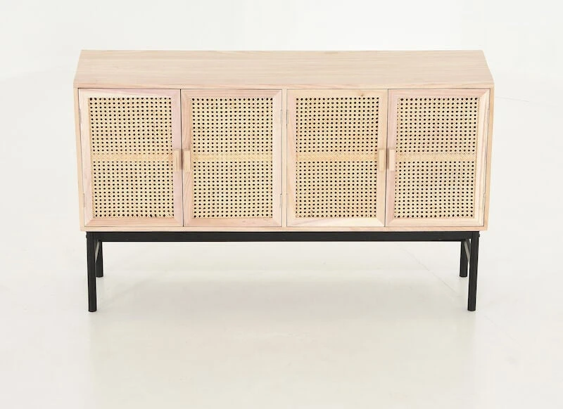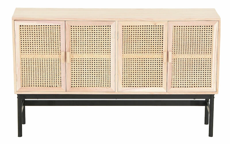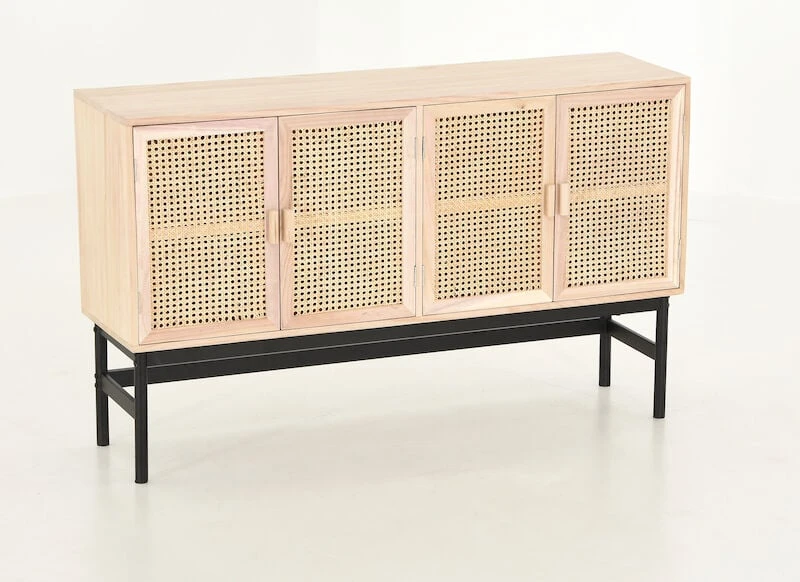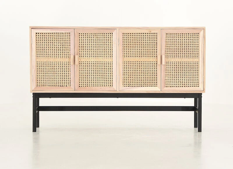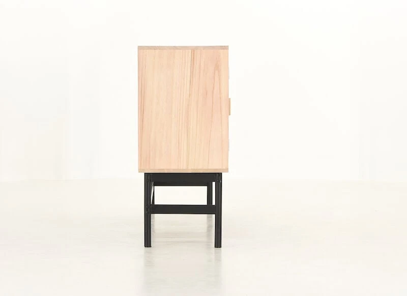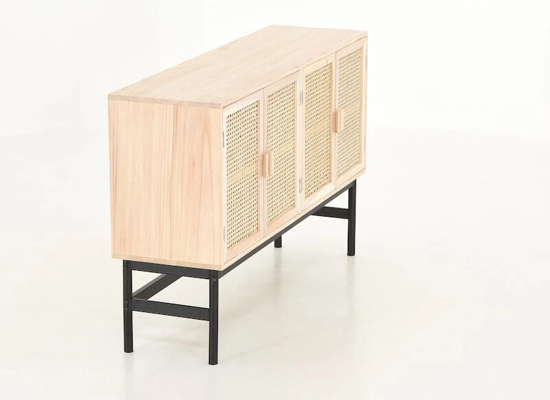 Kairo senkissä on ovien takana mukavasti hyllytilaa kodin tavaroille. Senkissä on kahdeksan samankokoista kiinteää hyllyä. Korkeat mustaksi maalatut teräsputkijalat tuovat senkkiin ilmavuutta ja modernia linjakkuutta. Kaapin runko, hyllylevyt ja ovien kehykset ovat hiottua, käsittelemätöntä keisaripuuta ja ovet rottinkipunosta. Säilytystilan mitoissa kerrotaan yhden lokeron tarkemmat sisämitat.