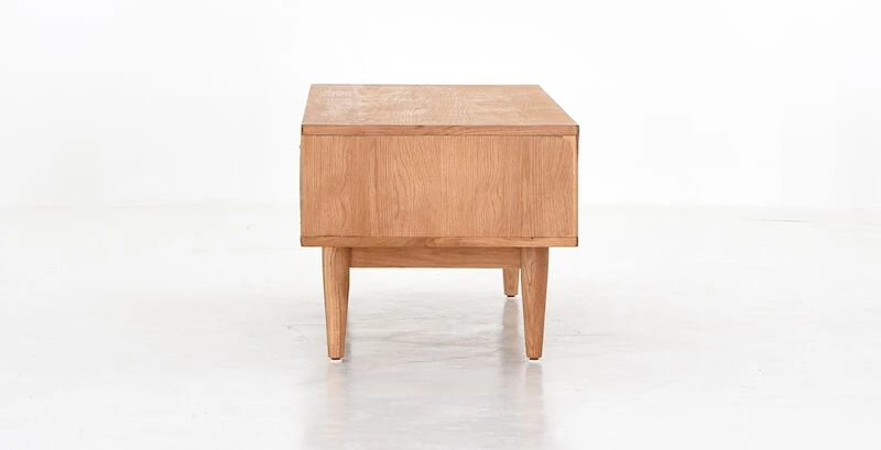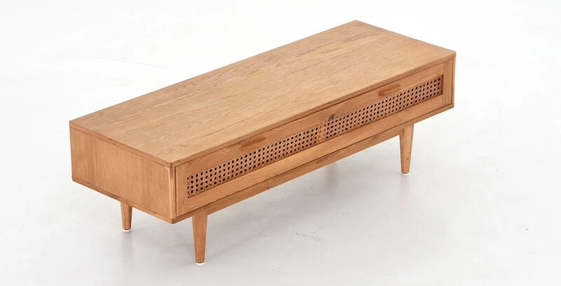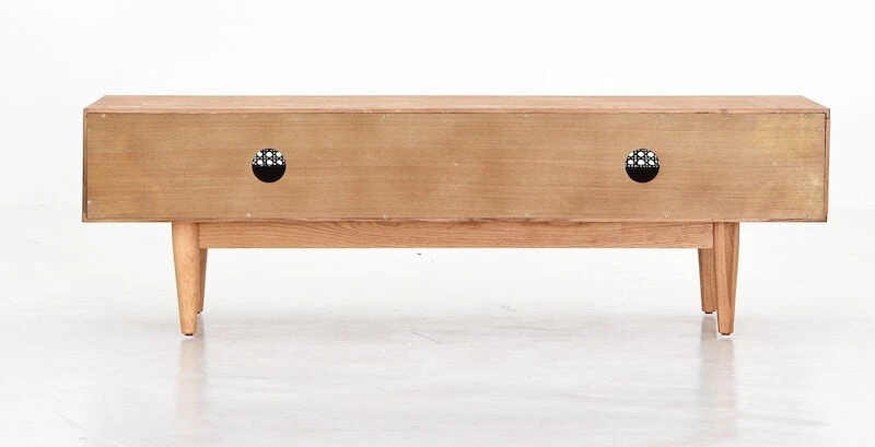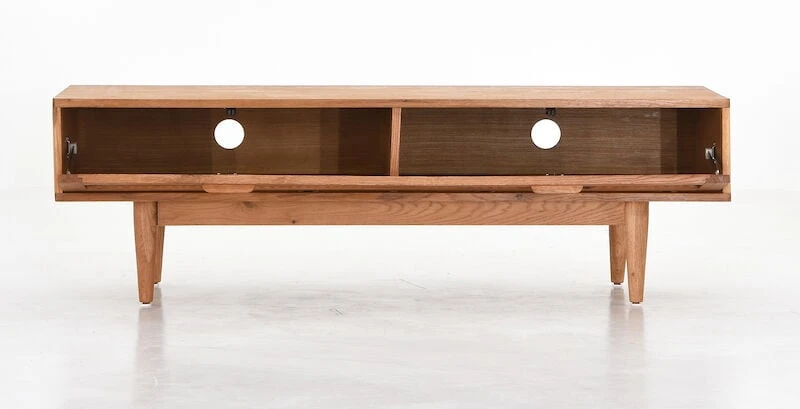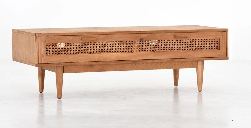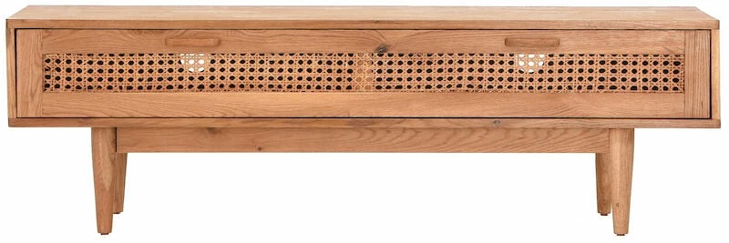 Näyttävä Kielo TV-taso jossa yhden saranoidun luukun takana kaksi säilytystilaa. Johtoja varten läpiviennit molempien säilytystilojen takaseinässä. Runko tammiviilutettua vaneria, ovien kehykset ja jalat tammea, ovissa rottinkipunos. Korkeat ja kepeät jalat antavat ilmavuutta ja helpottavat siivousta.
