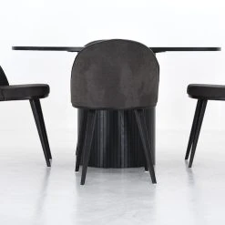 Tyylikäs Korpi-Louna 4-hengen ruokailuryhmä. Moderniin Korpi pyöreään ruokapöytään yhdistetty kauniit kangasverhoilut Louna tuolit. Pyöreä ruokapöytä sopii pieneenkin tilaan. Pöydän kansi on tammiviilutettua mdf-levyä ja kaunis jalkaosa on puuta. Kannen halkaisija on 130 cm. Louna tuolin verhoilu, puiset lakatut saarnijalat ja vähäeleinen muotoilu tekevät tuolista tyylikkään ja elegantin. Tuolin istuinpehmusteen vahvuus 5 cm, Verhoilu ja istuintyyny ovat kiinteät. Tuoli on verhoiltu Alaska kankaalla, joka on 100% polyesteriä. Kankaan martindale on 30 000, pilling 4-5, eli kangas ei nyppyynny herkästi. Kangas kestää hyvin valoa, sillä sen valonkesto on 5 (1-5 asteikolla).
