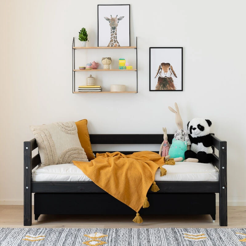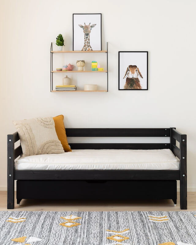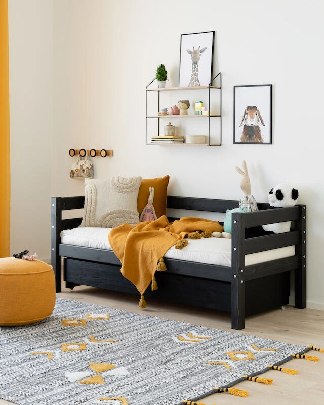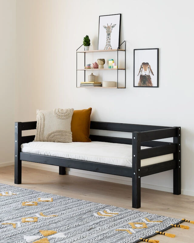Suosittu Liisa pieni lastensänky mahtuu koonsa puolesta pienempäänkin tilaan! Se vie vain vähän tilaa, mutta on juuri sopiva lapselle. Sänky on valmistettu männystä, ja siinä on kestävä sälepohja. Kuultomaalattu valkoiseksi. Patjakoko 70 cm x 155 cm. Toimitetaan osina paketissa, mukana selkeät kasausohjeet. Kuvissa näkyvät patja ja päiväpeitto sekä sängynaluslaatikko ja täyspitkä valkoinen turvalaitapaketti ovat ostettavissa erikseen. Kuvasta poiketen pitkää turvalaitaa mustana ei tällähetkellä ole saatavilla. Löydät ne osta lisäksi-tuotteista.
