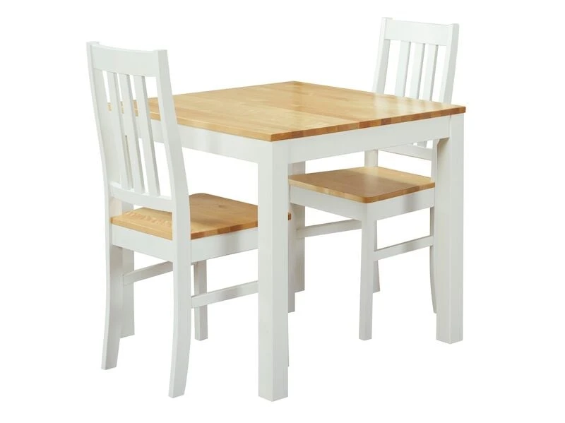Laadukas pieni 2-hengen ruokailuryhmä. Pöydän koko 80×80 cm johon mahtuu hyvin 2 tuolia. Koivunväri kansi on valmistettu tukevasta koivusta, jalat MDF:ää ja sarjapuu koivuvaneria. Poikkeuksena kokonaan valkoinen tuote, jonka jalat ja kansi on MDF:ää ja sarjapuu koivuvaneria. Jaloissa on viillot. Pintakäsitelty petsilakalla tai valkoisella maalilla riippuen väristä. Pieneen tilaan käytännöllinen ja kunnollinen ruokailuryhmä kahdelle. Tuolin leveys leveimmästä kohdasta istuimen etuosasta 41,5 cm ja leveys kapeimmasta kohdin eli selkänojan kohdalta 33,5 cm. Sarjapuun korkeus 7 cm. Tuolit toimitetaan valmiiksi kasattuina ja pöytä jalat irrallaan.