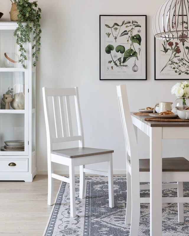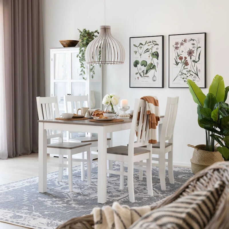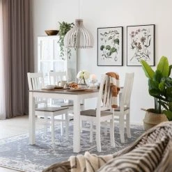 Tukeva ja ajaton 4-hengen Moona ruokailuryhmä. Pöydän kansi valmistettu tukevasta koivusta. Poikkeuksena kokonaan valkoinen tuote, jonka kansi ja jalat ovat mdf:ää ja sarjapuu koivuvaneria. Pöydän valkoiset jalat ovat aina MDF:ää. Valkoiset tuolit ovat myös aina mdf:ää. Musta väri, pöydän sarjapuu/sokkelit koivuvaneria ja jalat mdf:ää sekä harmaat värit petsattua koivua. Pintakäsitelty petsilakalla tai valkoisella maalilla riippuen väristä. Sarjapuun korkeus 7 cm. Tuolin leveys leveimmästä kohdasta istuimen etuosasta 41,5 cm ja kapeimmasta kohdin eli selkänojan kohdalta 33,5 cm. Tuolit toimitetaan valmiiksi kasattuina ja pöytä jalat irrallaan.