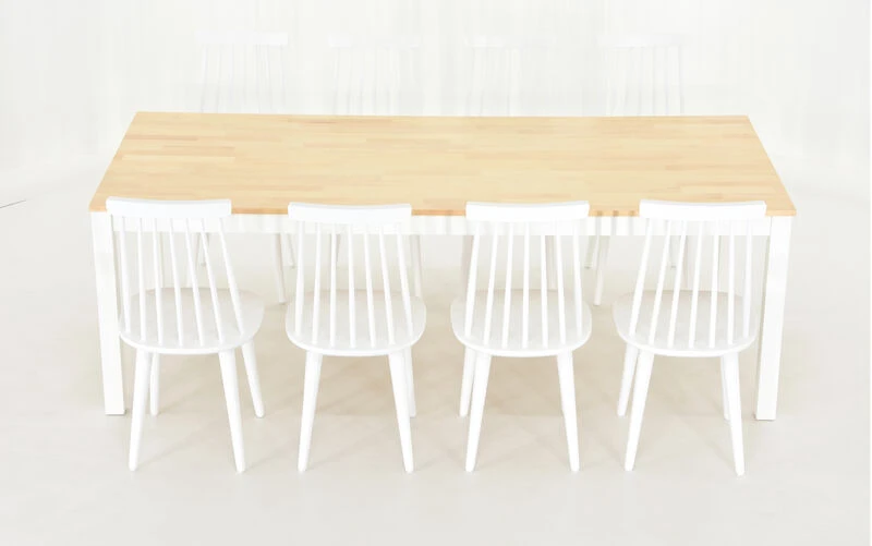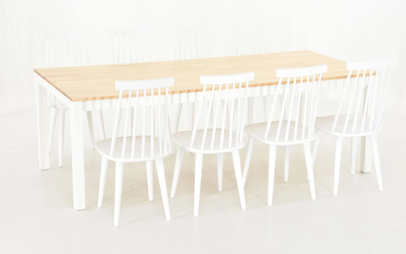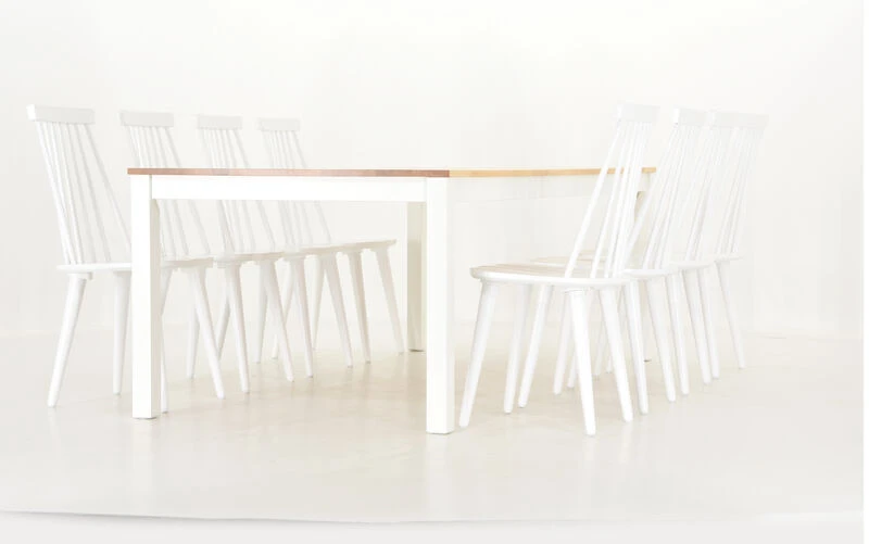 Moona-Lotta ruokailuryhmä on kaunis kokonaisuus upeilla pinnatuoleilla kahdeksalle hengelle.