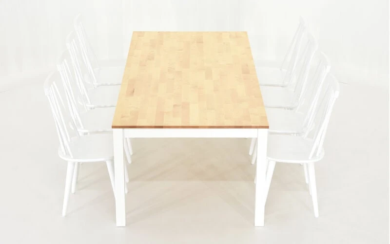 Puunvärinen pöydän kansi on koivua, sarjapuu koivuvaneria ja jalat mdf:ää. Pöydän pinta on lakattu. Valkoisen pöydän kansi sekä jalat ovat valkoiseksi maalattua mdf:ää ja sarjapuu koivuvaneria. Valmistusmaa Viro.