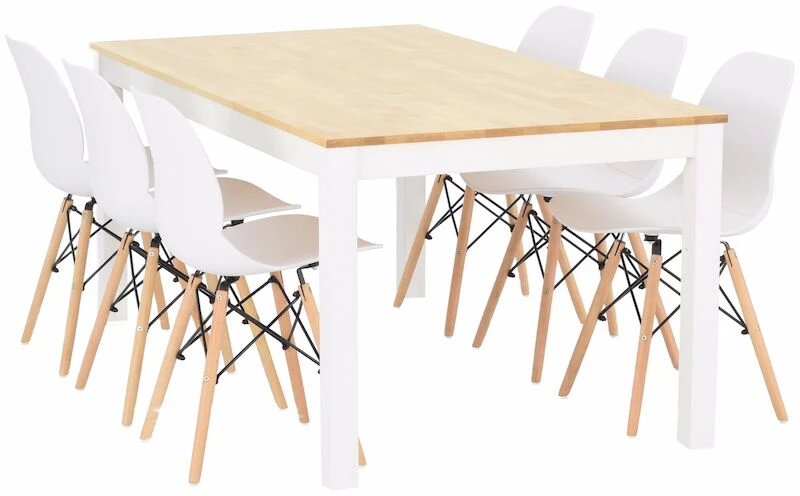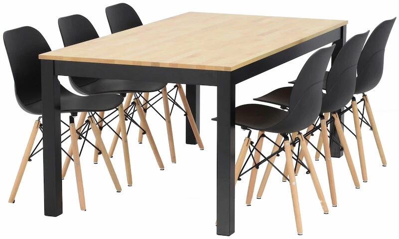 Moderni ja ajaton Rana-Moona ruokailuryhmä kuudelle hengelle. Moona pöytä on valmistettu tukevasta koivusta, poikkeuksena kokonaan valkoinen, jonka jalat ja kansi on MDF:ää ja sarjapuu koivuvaneria sekä musta, jonka pöydän sarjapuu/sokkelit ovat vaneria ja jalat MDF:ää. Pintakäsitelty petsilakalla tai valkoisella maalilla riippuen väristä. Rana tuoli on tukeva, mutta mukavan kevyt liikutella ja siinä on hyvä istua. Istuin- ja selkäosa on laadukasta ja joustavaa ABS-muovia. Tuolin jalat käsittelemätöntä, luonnonväristä pyökkiä.