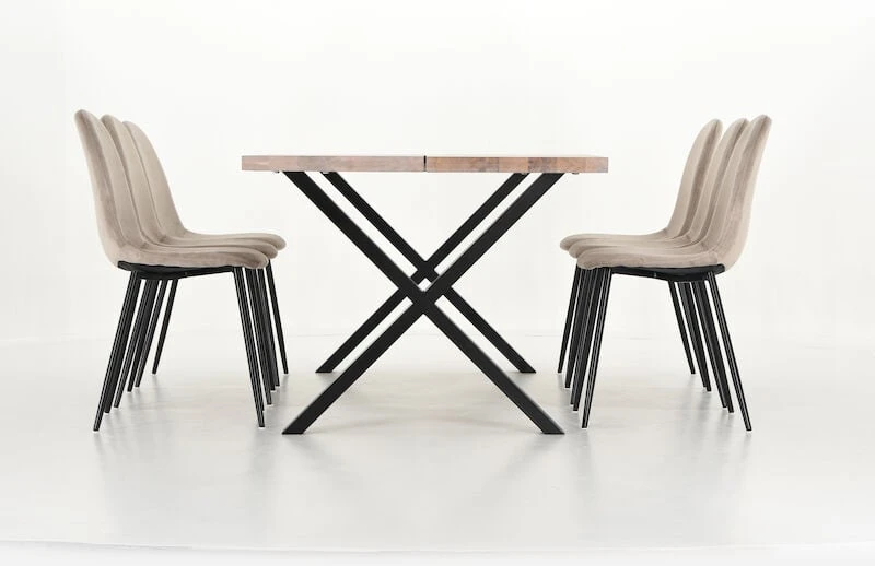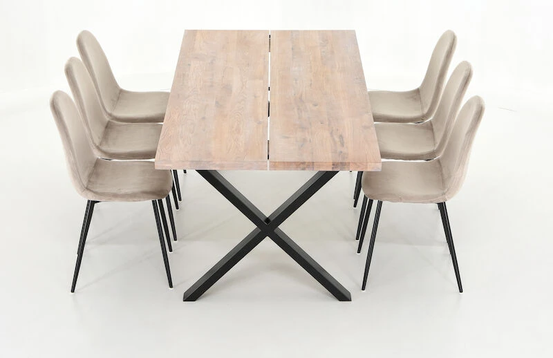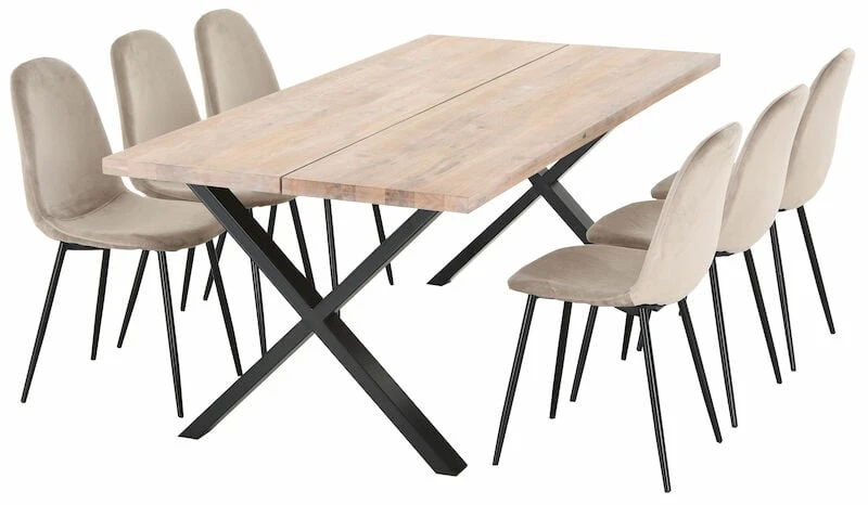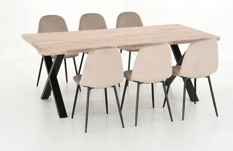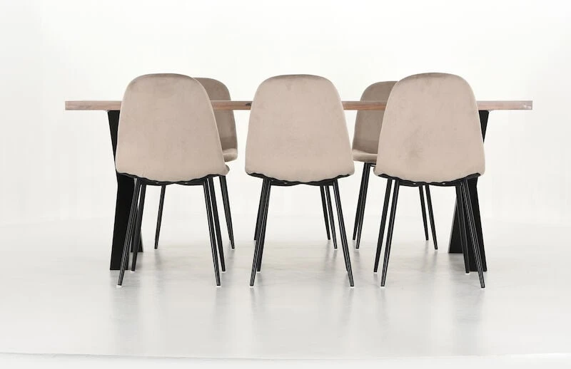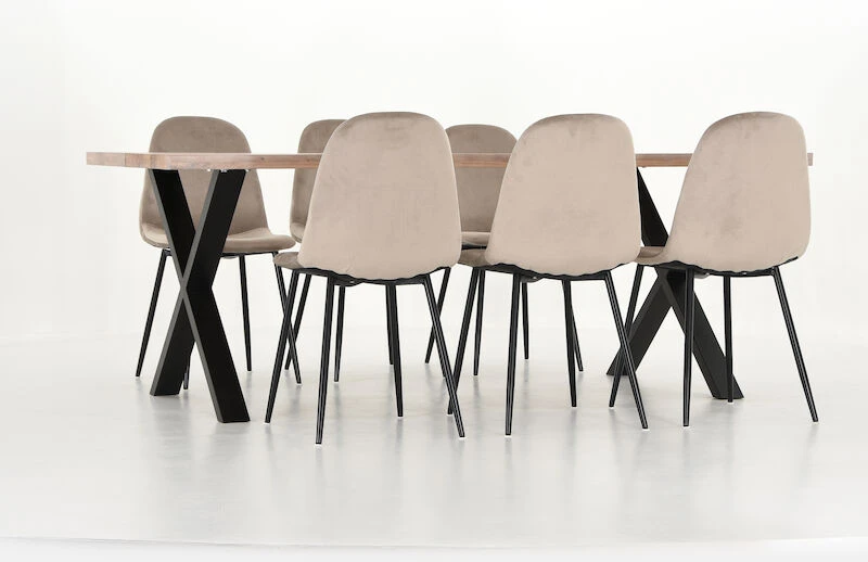 Hienostunut Orvo-Furia 6-hengen ruokailuryhmä muodostuu upeista Furia tuoleista ja Orvo ruokapöydästä. Tuolien alkuperämaa on Kiina ja pöydän Ukraina. Pöydässä on ihana öljytty tamminen kansi yhdistettynä X jalkoihin, jotka ovat mustaksi maalattua metallia. Pöytä on maskuliininen ja jämäkkä ja tuolit tuovat siihen ihanan feminiinisen kosketuksen. Tuoleissa on alumiiniset jalat ja istuinosat on verhoilut ihanalla samettikankaalla. Tammi on luonnonmateriaali, jonka vuoksi sen ominaisuuksiin kuuluu ihanat värivaihtelut, ajan kanssa tummuminen sekä pienet halkeamat. X-malliset jalat keventävät ilmettä ja ovat piste i:n päälle. Ruokapöytää pystyy myös jatkamaan ja Orvo ruokapöydille käy osta lisäksi tuotteena olevat jatkopalat. Pöytä ja tuolit toimitetaan jalat irrallaan. Tuolin jalan korkeus on 46 cm.