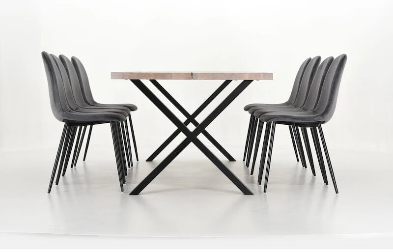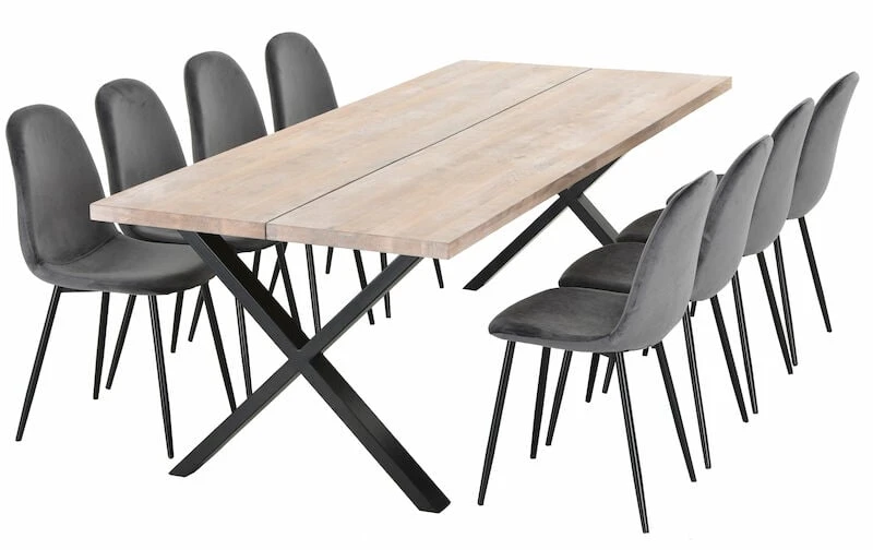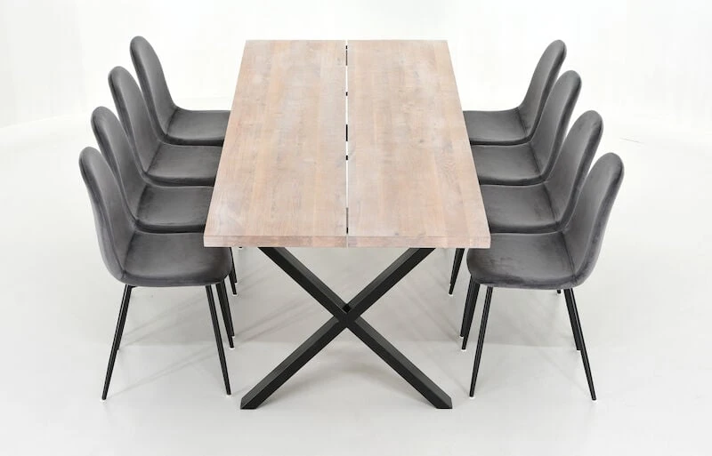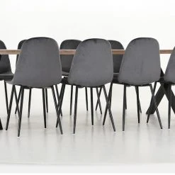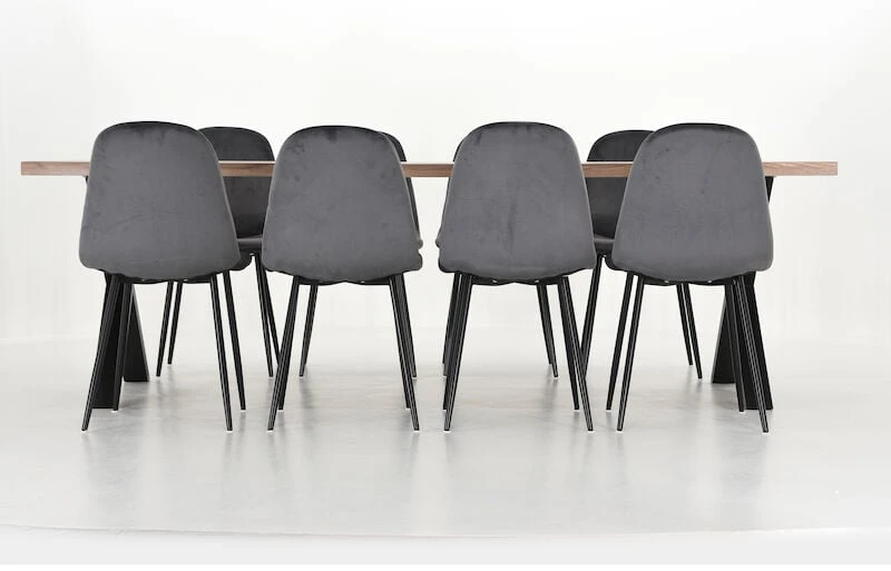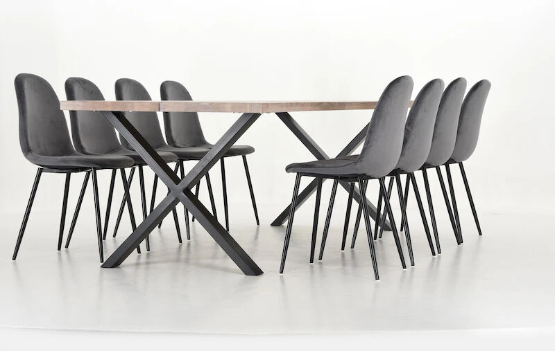 Hienostunut Orvo-Furia 8-hengen ruokailuryhmä muodostuu upeista Furia tuoleista ja Orvo ruokapöydästä. Tuolien alkuperämaa on Kiina ja pöydän Ukraina. Pöydässä on ihana öljytty tamminen kansi yhdistettynä X jalkoihin, jotka ovat mustaksi maalattua metallia. Pöytä on maskuliininen ja jämäkkä ja tuolit tuovat siihen ihanan feminiinisen kosketuksen. Tuoleissa on alumiiniset jalat ja istuinosat on verhoilut ihanalla samettikankaalla. Tammi on luonnonmateriaali, jonka vuoksi sen ominaisuuksiin kuuluu ihanat värivaihtelut, ajan kanssa tummuminen sekä pienet halkeamat. X-malliset jalat keventävät ilmettä ja ovat piste i:n päälle. Ruokapöytää pystyy myös jatkamaan ja Orvo ruokapöydille käy osta lisäksi tuotteena olevat jatkopalat. Pöytä ja tuolit toimitetaan jalat irrallaan. Tuolin jalan korkeus on 46 cm.
