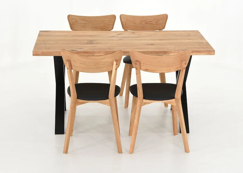 Ryhmän kruunaa tyylikkäät puiset ruokapöydän tuolit, joiden istuinosa on verhoiltu PU-keinonahalla. Mustat tuolit ovat saarnia, jotka on pintakäsitelty lakkaamalla. Puunväriset tuolit ovat öljyttyä tammea, jotka on suositeltavaa käsitellä noin kerran vuodessa huonekaluille tarkoitetulla öljyllä. Tuolit toimitetaan valmiiksi kasattuina.