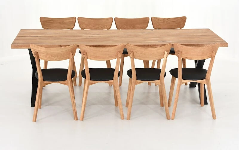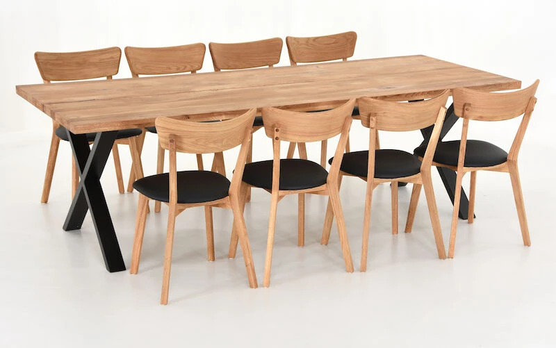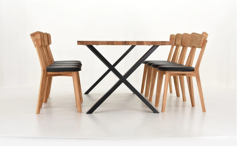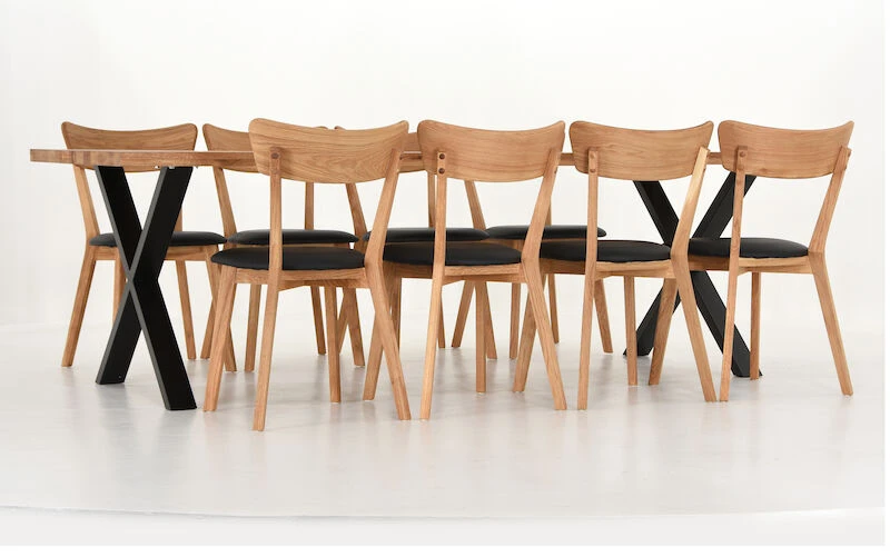Ryhmän kruunaa tyylikkäät puiset ruokapöydän tuolit, joiden istuinosa on verhoiltu PU-keinonahalla. Mustat tuolit ovat saarnia, jotka on pintakäsitelty lakkaamalla. Puunväriset tuolit ovat öljyttyä tammea, jotka on suositeltavaa käsitellä noin kerran vuodessa huonekaluille tarkoitetulla öljyllä. Tuolit toimitetaan valmiiksi kasattuina.