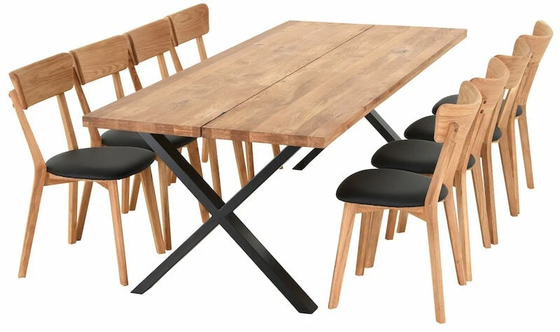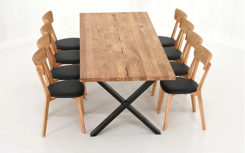 Orvo-Koto on todella tyylikäs ruokailuryhmä, jossa kodikkuutta ja lämpöä henkii upea tammesta valmistettu pöydän kansi. Tukevan pöydän kansi on valmistettu kahdesta leveästä lankusta ja pöydän x-mallinen jalka on maalattua metallia. Pöydän pinta on käsitelty öljyämällä. Pinta on suositeltavaa öljytä säännöllisesti, jotta se pysyy kauniina. Pöytää pystyy jatkamaan Orvo ruokapöydille tarkoitetulla jatkopalalla. Toimitetaan jalat irrallaan.
