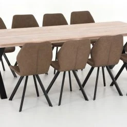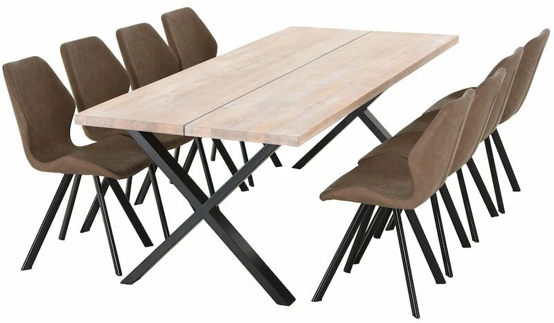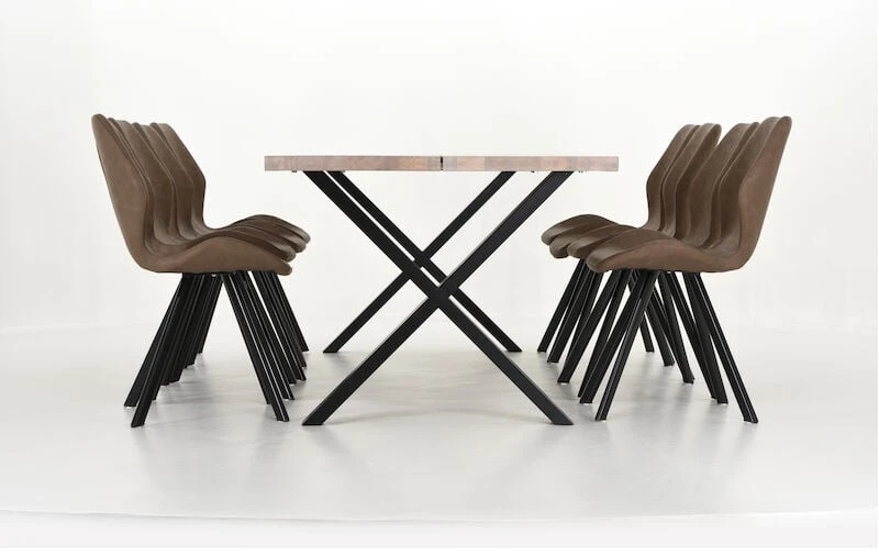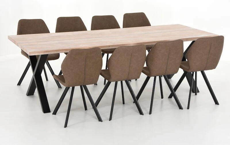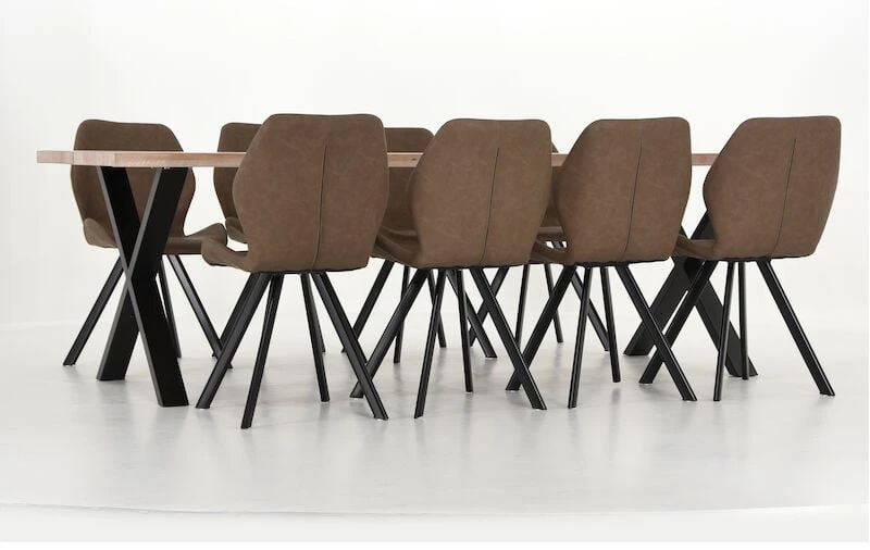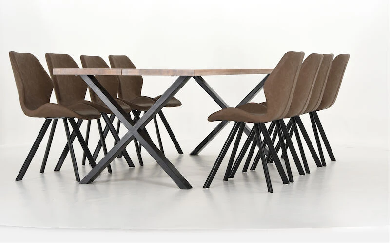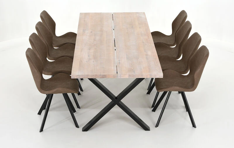Näyttävä ja maskuliininen Orvo-Punnus 8-hengen ruokailuryhmä muodostuu upeista PU-keinonahkaisista Punnus tuoleista ja Orvo ruokapöydästä. Tuolien alkuperämaa on Kiina ja pöydän Ukraina. Iso koko mahdollistaa isot illanistujaiset, illalliset ja juhlahetket! Pöydässä on ihana öljytty tamminen kansi yhdistettynä X jalkoihin, jotka ovat mustaksi maalattua metallia. Pöytä on maskuliininen ja jämäkkä ja tuolit tuovat siihen lisää rohkeutta ja ilmettä. Tammi on luonnonmateriaali, jonka vuoksi sen ominaisuuksiin kuuluu ihanat värivaihtelut, ajan kanssa tummuminen sekä pienet halkeamat. X-malliset jalat keventävät ilmettä ja ovat piste i:n päälle. Ruokapöytää pystyy myös jatkamaan ja Orvo ruokapöydille käy osta lisäksi tuotteena olevat jatkopalat. Pöytä ja tuolit toimitetaan jalat irrallaan. Tuolin jalan korkeus on 42,9 cm.