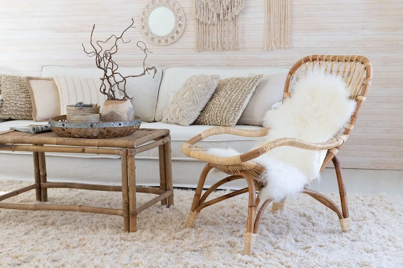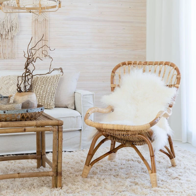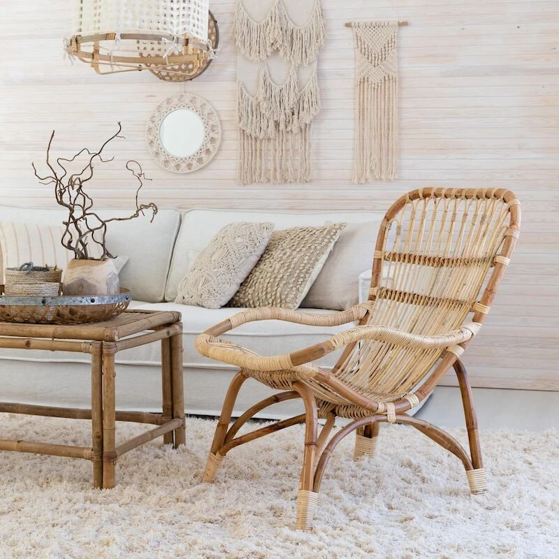 Hinta sisältää rottinkinojatuolin, ei sisällä miljöökuvissa näkyvää taljaa ja muita tuotteita.