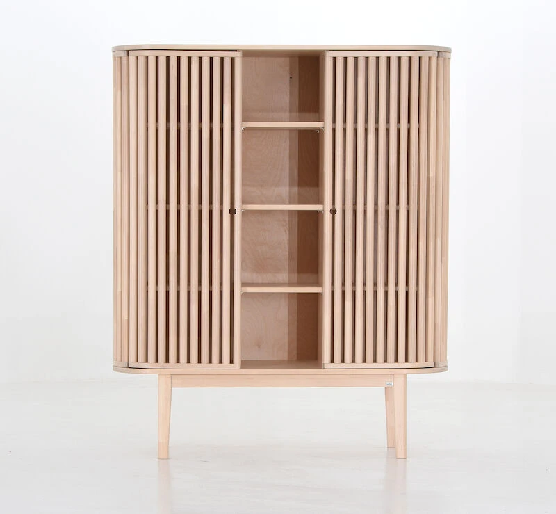 Rima sarjassa kaunis kaareva muoto on toteutettu laadukkaasti viimeistellyillä, koivusta valmistetuilla pyörörimoilla. Kaapin molemmilla sivuilla on ovet, joiden takana on kolme korkeussäädettävää hyllyä, molemmin puolin. Keskellä avointa hyllytilaa. Laadukas, koivusta valmistettu kaappi valmistetaan Suomessa, Kiteen huonekalutehtaalla. Kaapin taustapuoli on koivuvaneria.