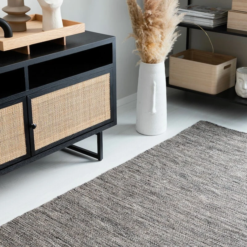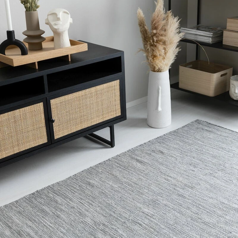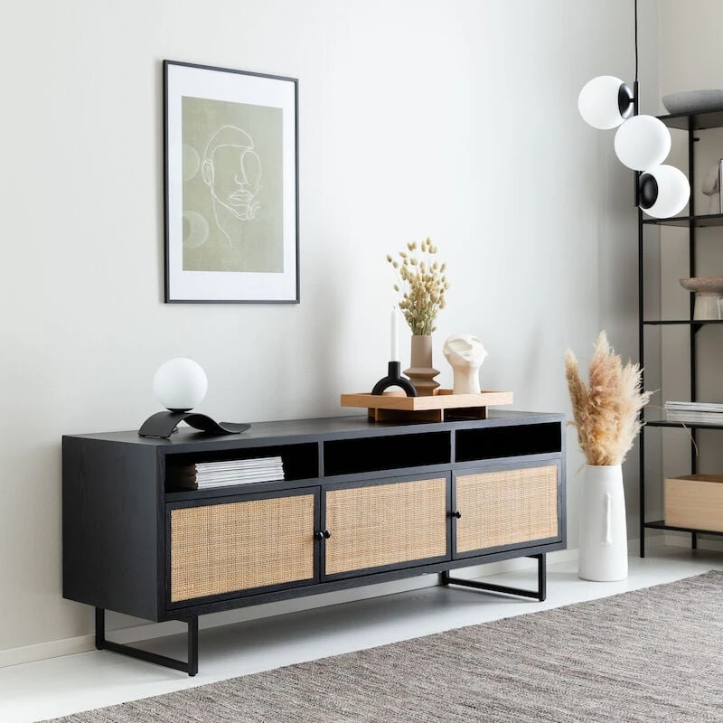 Savanni tv-taso on tyylikäs kokonaisuus. Kaunis luonnonrottinki pehmentää muuten kokonaan mustan tv-tason ilmettä. Tv-tason runko on MDF-levyä, etusarjat kaunista rottinkia. Ovissa on pienet metallivetimet. Tv-tasossa on yhtenäinen kaappitila kolmen oven takana. Kaappien yläpuolella on avoimet lokerikot. Tv-tason taustalevyssä on yhteensä kolme halkaisijaltaan 6 cm:stä läpivientiaukkoa johdoille.