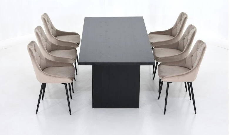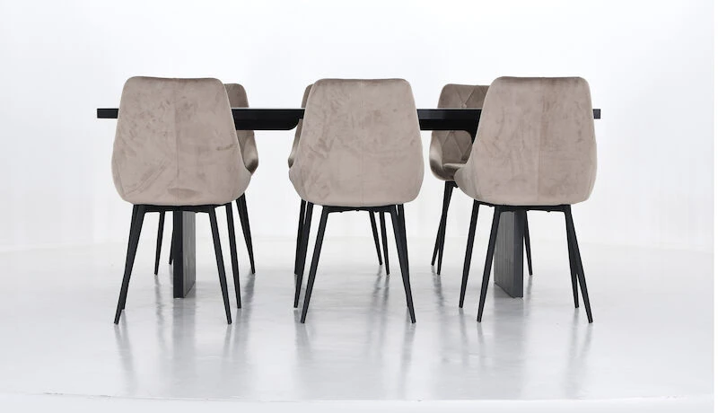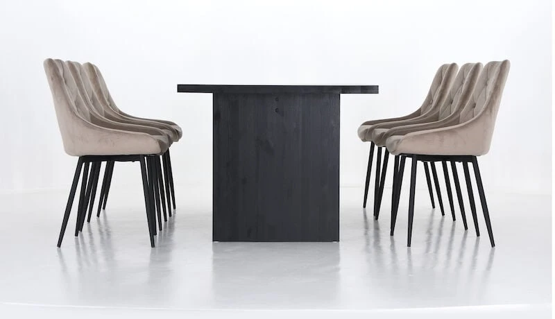 Alberton tuolin kauniina yksityiskohtana on selkänojan koristenapit. Pehmustettu istuinosa tekee siitä miellyttävän istua. Samettiverhoilu on 100% polyesteriä, joka hylkii likaa ja vettä. Tuolissa on tyylikkäät mustat metallijalat. Valmistusmaa Kiina