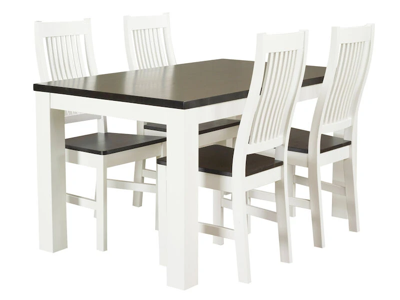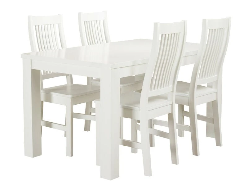 Erittäin tukeva, koivusta valmistettu 4-hengen ruokailuryhmä tuoleilla, joilla on todella hyvä istua. Ruokailuryhmä valmistettu tukevasta koivusta, poikkeuksena valkoinen kansi sekä valkoiset että mustat jalat, jotka valmistettu MDF-levystä. Pintakäsitelty petsilakalla tai valkoisella maalilla riippuen väristä. Sarjapuun korkeus 7 cm. Tästäpä kotiisi kunnollinen 4-hengen ruokailuryhmä tuoleilla. Jämäkkyyttä ja ajattomuutta. Tuolit toimitetaan valmiiksi kasattuina ja pöytä jalat irrallaan.